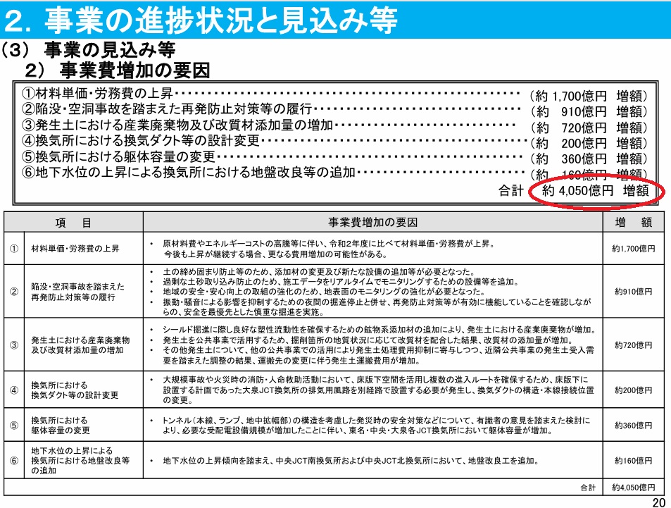 しかし、陥没事故原因と対策についてはNEXCO東日本と鹿島 JV の負担割合が決まっていないとして、事故処理関連費用は含まれていない。また、青梅街道インターチェンジ 拡幅部の工法変更の費用増加分も含まれていないとのことです。