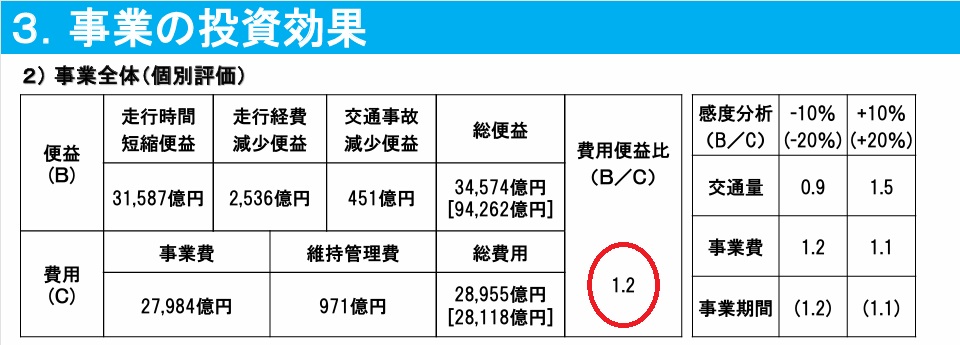 経済効果や渋滞緩和、羽田空港からアクセス向上などさまざまなメリットをアピール、試算してB/Cを改善させたのではないかと疑義を感じます。