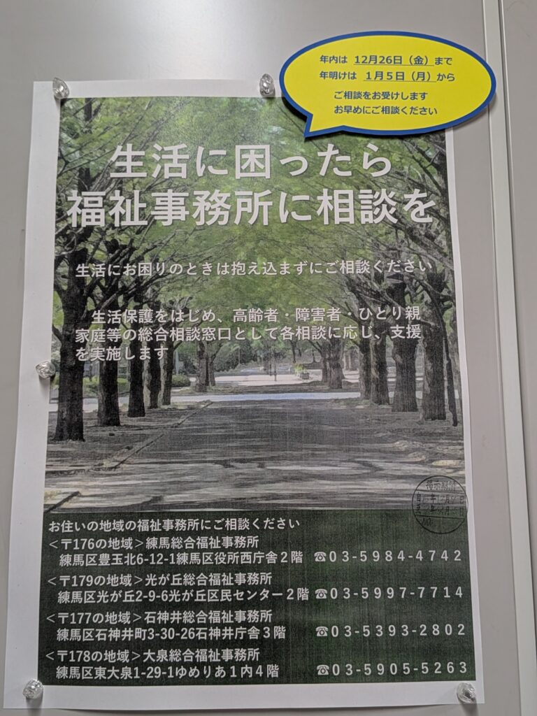 令和5年度から生活にお困りの方は、開庁期間中、早めに福祉事務所へ相談していただけるよう、呼びかけを行っています。今年も9連休と長期になるため、区公式XやLINEで今月1日に呼びかけを行い、引き続き中旬にも実施します。