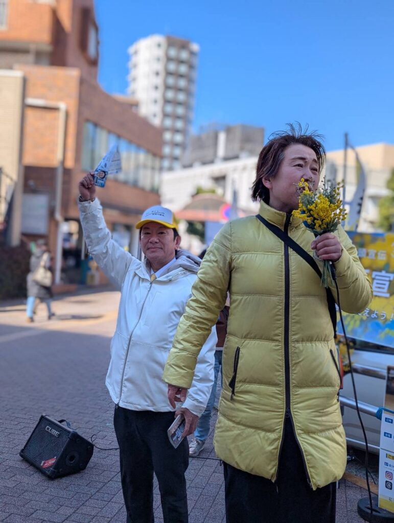 ミモザのブーケを持ってジェンダー平等を訴える、生活者ネットワークの山﨑まりも練馬区議