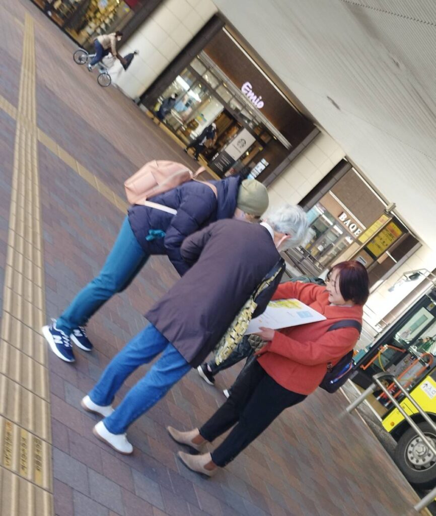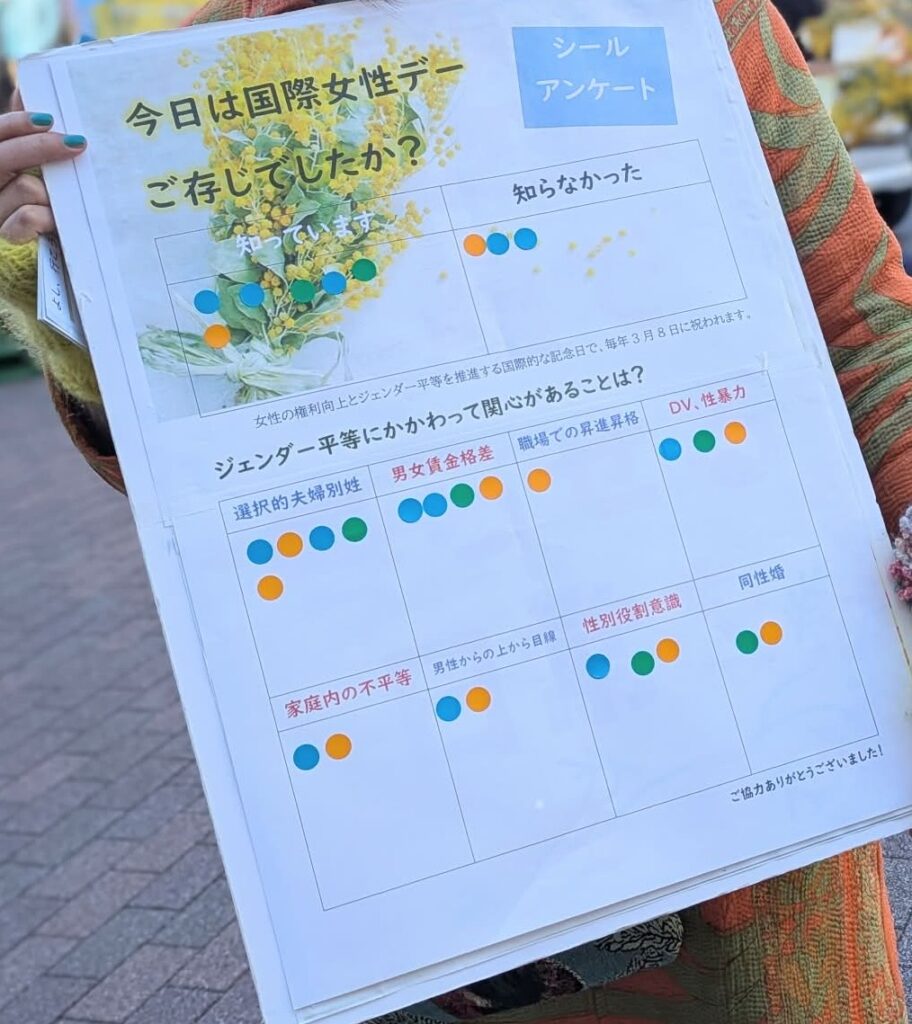 区内でジェンダー問題に取り組む活動団体などと連携して、石神井公園駅前でのミモザ街宣に参加し、ジェンダー格差解消に関するシールアンケートに取り組みました。