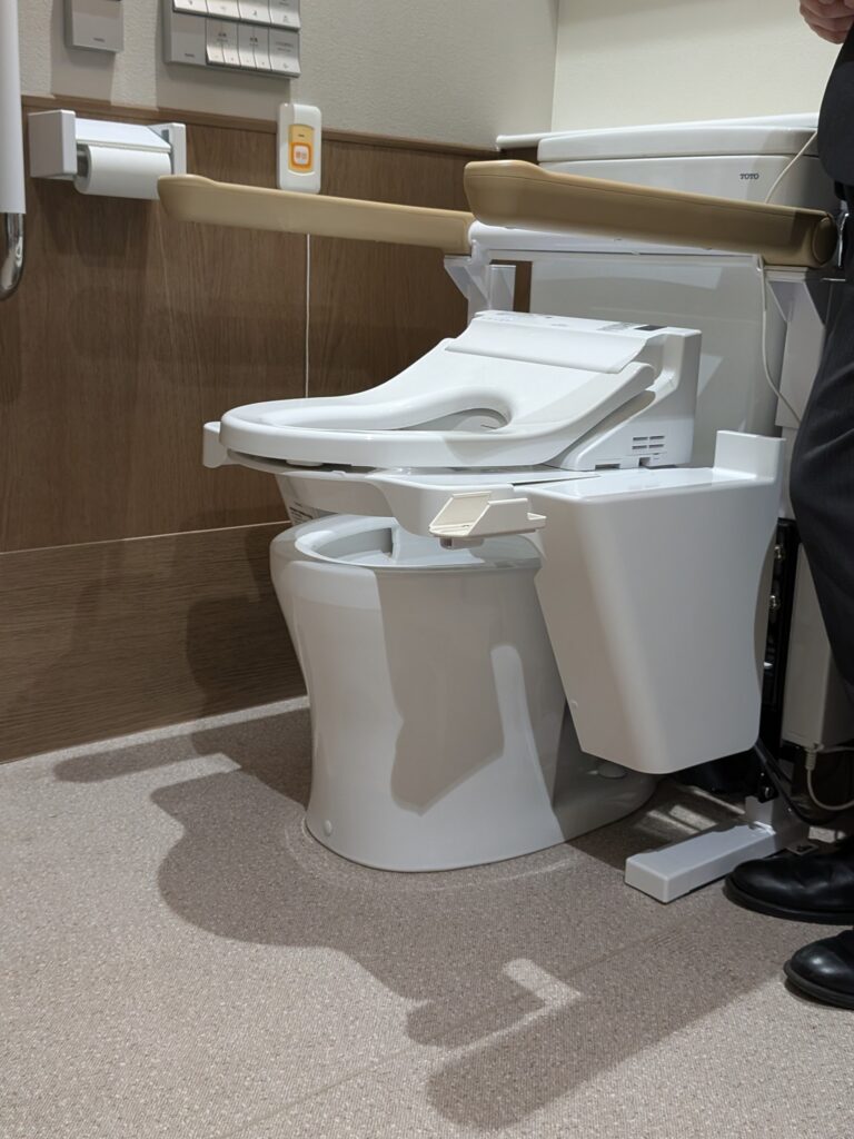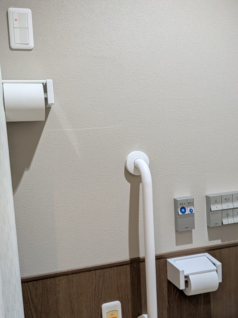 介護職員が利用者の目の前でトイレットペーパーをとらなくても良いように、トイレットペーパーが高い位置にもあり、利用者の尊厳を守るための配慮がなされている