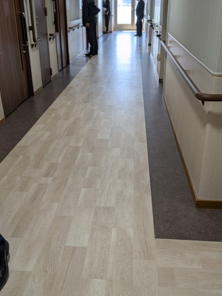 車いすの収納などですっきりした廊下。さらに色の違いで居室と通路がわかるようになっている