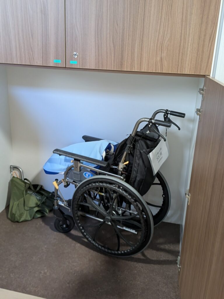 居室の入り口廊下側に車いすの収納スペースがある